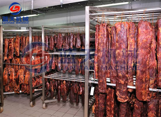 這一階段主要的制約因素是溫度的控制,為了加強(qiáng)干燥速度,溫度要升高到60到65度之間,烘干時(shí)間控制在10到12個(gè)小時(shí),相對(duì)濕度控制在35%左右。牛肉烘干最終濕度控制在15%以下。