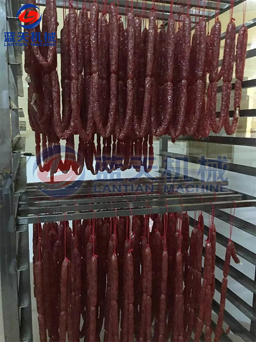 2、減速干燥階段。發(fā)色期和收縮定型期的控制,溫度控制在52℃~54℃,濕度控制在45%左右、時(shí)間為3到4個(gè)小時(shí),臘腸逐漸從淺紅色轉(zhuǎn)為鮮紅色,腸衣開始收縮,這時(shí)一定要注意硬殼的出現(xiàn),可以進(jìn)行冷熱交替使用,效果更好。