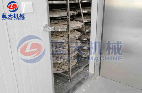 2、中濕中溫階段:溫度上升,但應(yīng)低于60℃,范圍為50-60℃,此段適當(dāng)換新風(fēng)除濕,根據(jù)濕氣多少合理調(diào)整。隨著溫度繼續(xù)升高,淮山片處于中溫中濕的狀態(tài),這時(shí)持續(xù)的溫度和循環(huán)風(fēng)將熱量均勻的送到烘房間的各個(gè)角落,山藥片持續(xù)蒸發(fā)出水汽并被排濕系統(tǒng)帶走。