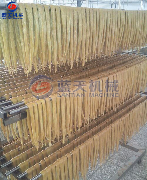 第三步——蒸煮抄條,將豆?jié){加熱時(shí),表面出現(xiàn)一層膜,即可將豆?jié){膜掛至竹竿上(此步稱為抄條),竹竿掛滿后轉(zhuǎn)移至烘車上。抄條時(shí)高溫操作注意操作人員人身安全。