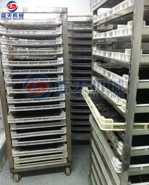 第四步:海參烘干:將煮好的海參擺放在物料盤上,將擺好海參的物料盤放置入空氣能熱泵海參烘干機內(nèi),通過智能控制系統(tǒng)設(shè)置烘干溫度、濕度和時間參數(shù),開始干燥。