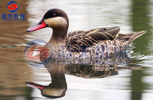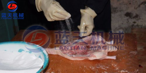 鴨只屠殺之前應(yīng)予12~24小時絕食,并給以充分清水,使之安靜休息。如此可使屠殺放血良好,并可減少未完全消化的飼料污染屠體的機會。經(jīng)屠殺后,將屠體外表洗凈,祛除余毛,并應(yīng)即速冷卻。鴨之屠體選用無骨折及瘀血斑點者,并將鴨只在肘關(guān)節(jié)及跗關(guān)節(jié)下端分別將兩翅及兩腳去掉。以左手抓住鴨之下額骨,右手持刀從口腔割掉帶舌的下額部,此處理俗稱割外五件。