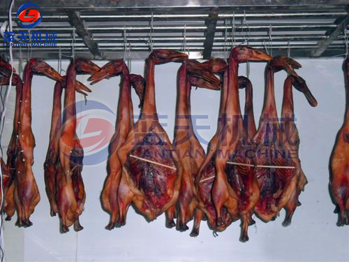 將擦干之鴨體加以整型,將其掛入竹杠上,放入空氣能板鴨烘干房。以空氣能板鴨烘干機為例設(shè)置烘干參數(shù),首先45~50℃熱風干燥約6小時后,移置于約15℃冷風處冷卻5~8小時,使鴨體定型,并可使皮膚出現(xiàn)乳白色,如用一次烘干時,則皮膚易變暗褐色,外觀不良。冷卻后之鴨只再以45~50℃熱風干燥。
