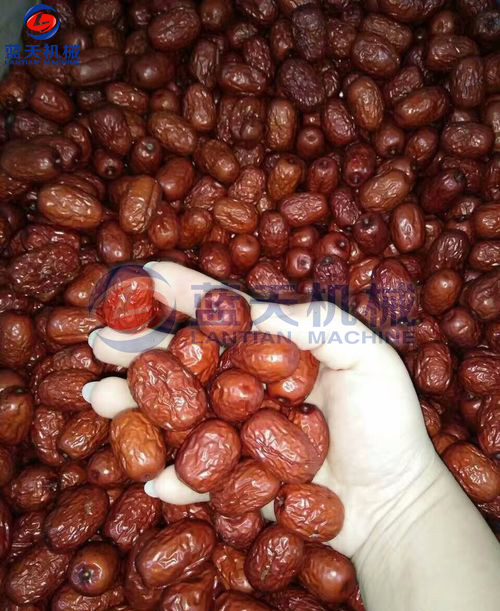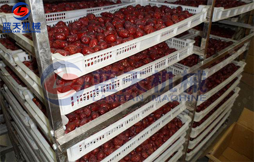 3、烘干工藝:先在熱水中瀝干棗表面的糖漿,然后裝入物料盤,將物料盤物料車,推入烘干房,使含水量降至15%左右,烘干溫度開始為50℃,過6-7小時升至70-80℃等棗皮發(fā)皺即可,用手摸感到外硬內(nèi)軟時取出包裝。