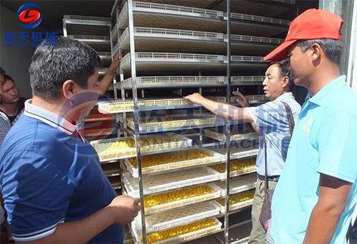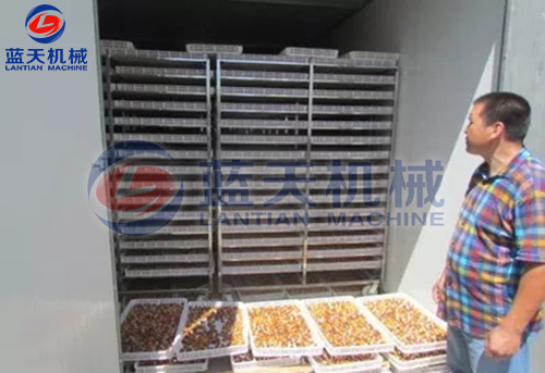 2)按照7P烘干除濕一體主機(jī)配置30立方烘干房,可放入物料車6臺,每次可以烘新鮮杏子2000斤,杏子干鮮比接近5:1。