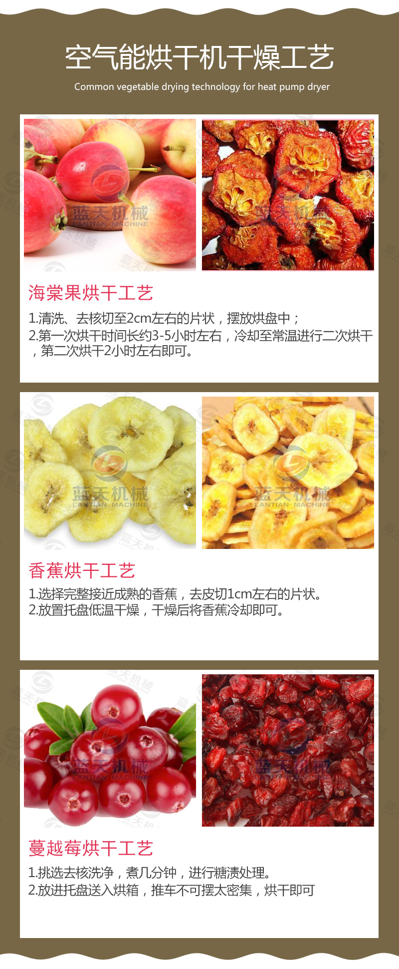 2.葡萄干烘干機熱泵烘干:托盤裝載量14~20kg/m~2,初溫45~50℃,終溫70~75℃;烘干時間42~60h。系統(tǒng)除濕量要大,脫水率已達(dá)70%。葡萄全干后仍保持綠色。烘干干燥適度的葡萄干,肉質(zhì)柔軟,用手緊壓無汁液滲出。含水量為 15%~17%,干燥率為3:1~4:1。