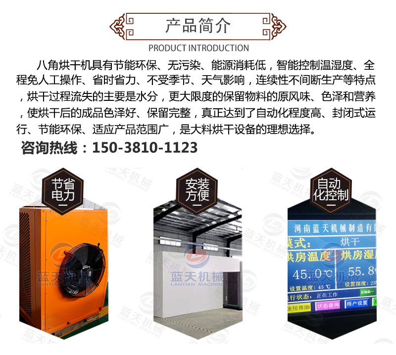 結(jié)合以上問題,新的八角烘干機(jī)出現(xiàn)了,這種設(shè)備是通過少許電能驅(qū)動(dòng)壓縮機(jī)做功,從而使系統(tǒng)中的冷媒吸熱放熱來實(shí)現(xiàn)熱量從高位轉(zhuǎn)移到低位的新能源設(shè)備,是一種氣流干燥設(shè)備,節(jié)能環(huán)保,智能化控制,不再看天氣,不再需要人守著,一鍵啟動(dòng),自動(dòng)烘干,自動(dòng)停機(jī)。